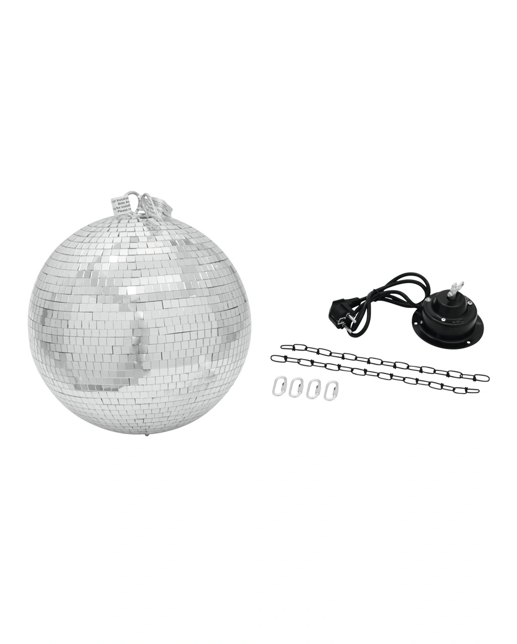 Dieses Modell in Profiqualität verfügt über einen formstabilen Kunststoffkern, hat einen Durchmesser von 40 cm und ist mit unzähligen kleinen Spiegeln (10 x 10 mm) bedeckt. Die DISCO Spiegelkugel wird mit Motor, der mit Eurostecker versehen ist geliefert. 2 Ketten und 4 dazugehörende Sicherheitskarabiner sorgen für die Aufhängung von Spiegelkugel am Drehmotor. Der sich langsam, drehende Motor müss mit Dübel fest an die Decke des Partyraums verschraubt werden.