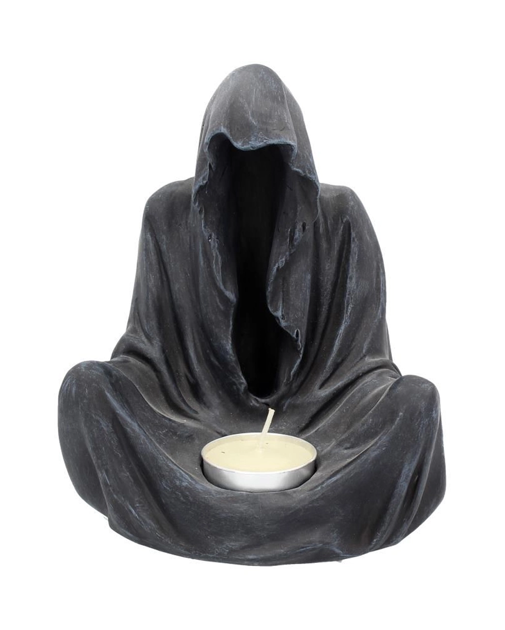 Der Grim Reaper Teelichthalter zeigt einen auf dem Boden sitzenden Gevatter Tod im schwarzen Kapuzenumhang, der auf seinem Schoß Platz für eine kleine Teelicht-Kerze hat. Dazu passen perfekt die 20 Premium Teelichter und an Halloween auch der Halloween Kürbis Teelichter 4 St..